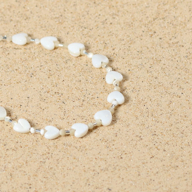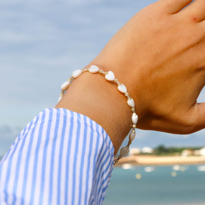 Tombez sous le charme de ce bracelet pour femme Inima, ce modèle authentique et délicat inspire la tendresse. Les cœurs de ce bijou artisanal pour femme apportent subtilement éclat à votre poignet. Le naturel du nacre blanc et beige évoque la beauté de la plage.