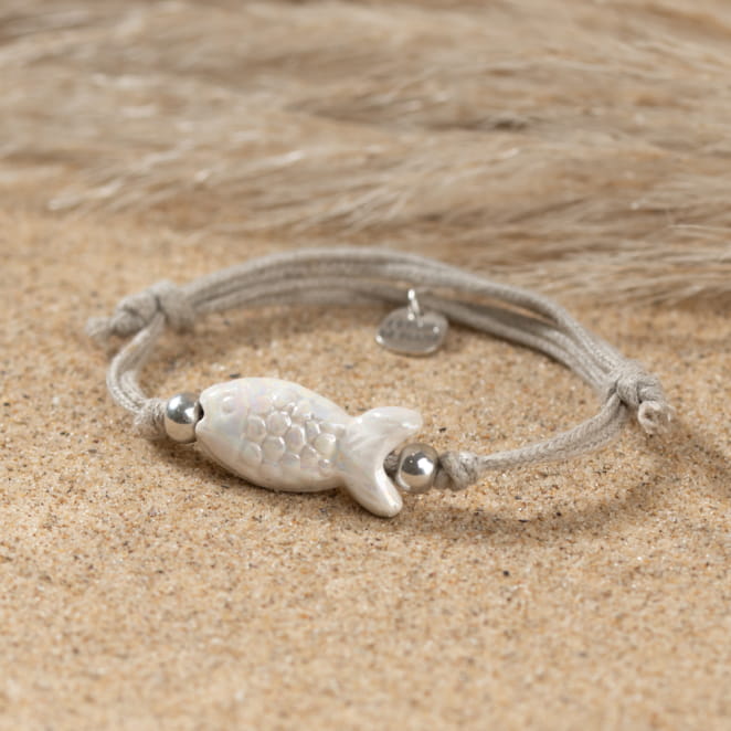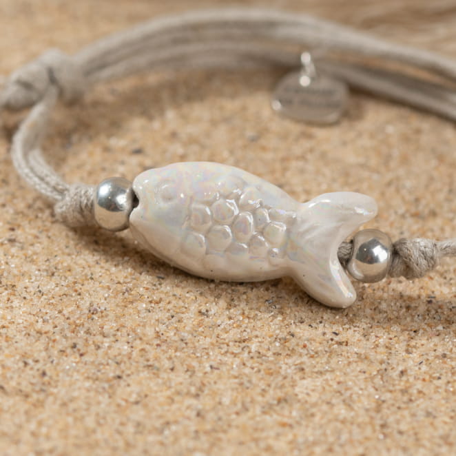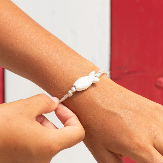 Le bracelet Jacqueline enchante avec son lin beige délicat, embrassant une pierre de céramique blanche en forme de poisson. voir plus