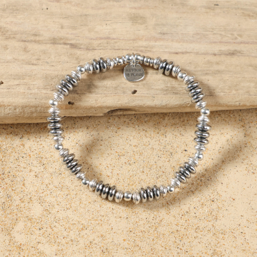 Laissez-vous séduire par le bracelet Janie, une création où la douceur des perles en céramique gris rencontre l’éclat des perles argentées et la profondeur des perles en verre et hématite gris. Ce bijou, à la fois léger et lumineux, s’enroule délicatement autour du poignet grâce à son élastique discret. Parfait pour celles qui recherchent une touche de naturel.