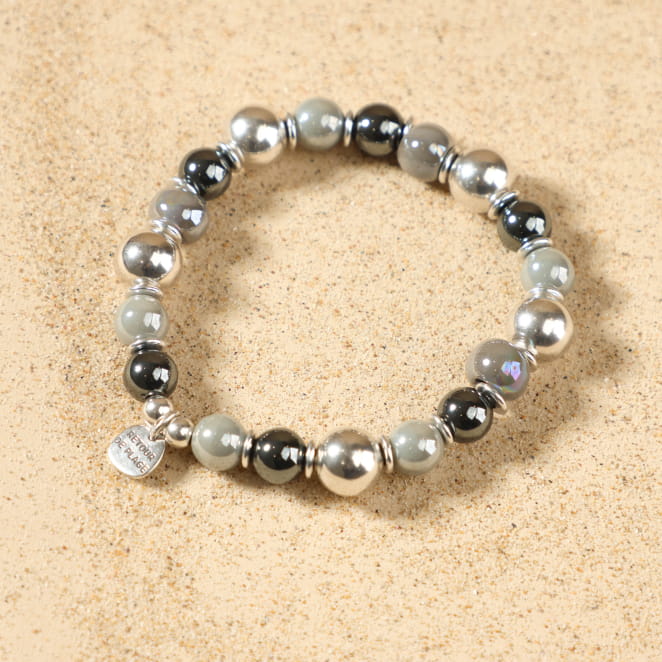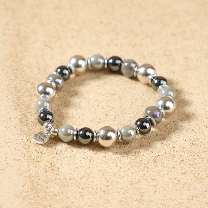 Laissez-vous séduire par le bracelet Janie, une création où la douceur des perles en céramique gris rencontre l’éclat des perles argentées et la profondeur des perles en verre et hématite gris. voir plus