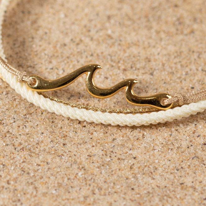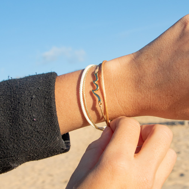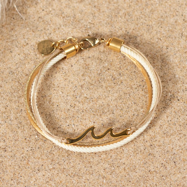 Plongez dans l'élégance marine avec notre bracelet multi-brins doré et beige Jaws. Le mouvement de l'océan s'exprime avec un pendentif en forme de vagues au centre, évoquant la fluidité des flots. Réalisé à la main en France, ce bijou capture l'esprit de l'océan, ajoutant une touche sophistiquée à votre tenue. Portez cet éclat doré pour une connexion instantanée avec la mer, un accessoire qui danse au rythme des vagues !