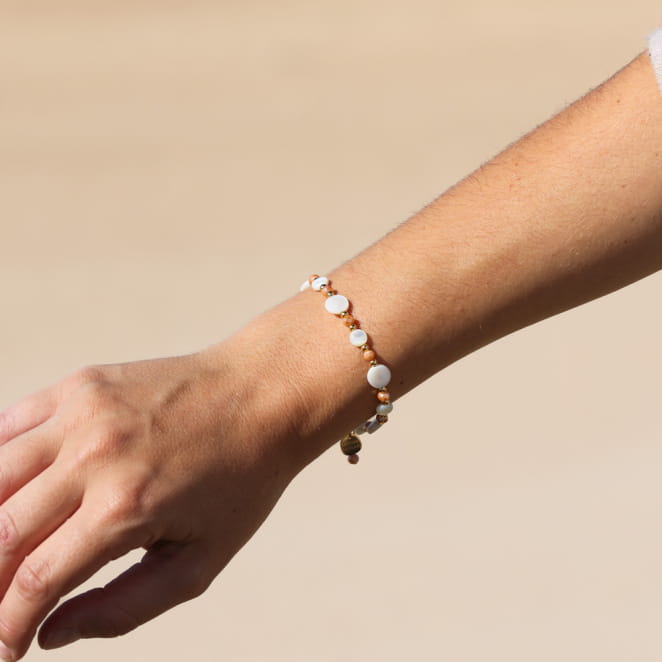 Accompagnez vos tenues tout en délicatesse et en élégance avec ce bracelet Jenny. Ses perles en verre beige et en nacre blanche habillent votre poignet tout en finesse. Un bijou tendance que vous pourrez porter au quotidien et aggrémenter facilement avec d'autres bracelets ! Pour un look parfait, craquez pour le collier et les boucles d'oreilles Jenny.
