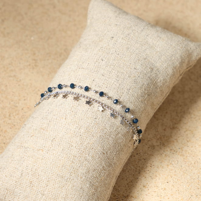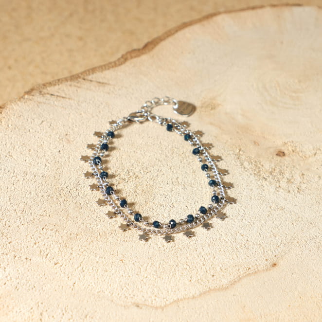 Découvrez le bracelet Judith ! Composé de deux chaînes délicates, l'une étoilée et l'autre ornée de perles en verre bleu marine, ce bijou incarne l'élégance et le raffinement. Idéal pour ajouter une touche sophistiquée à votre tenue, le bracelet Judith se distingue par son design unique et sa délicatesse intemporelle.