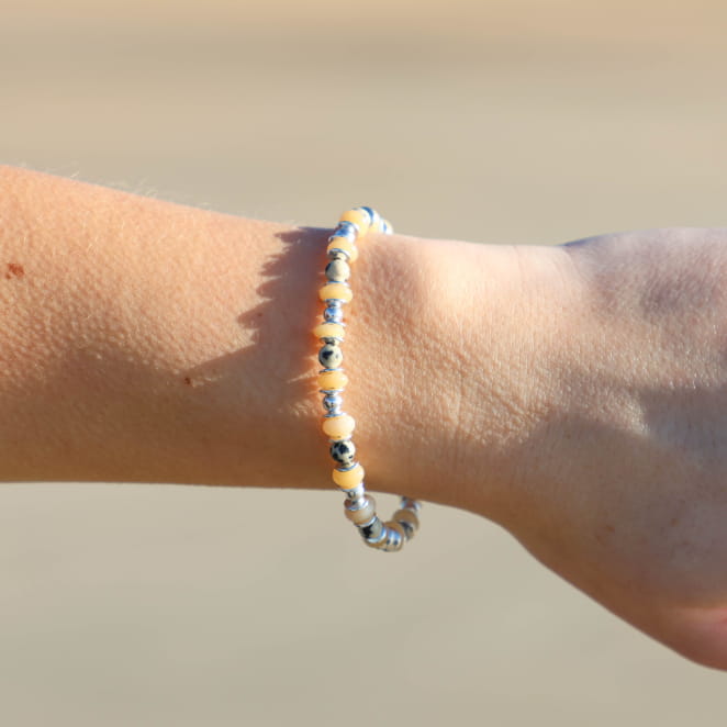 Apportez de la brillance et de l'élégance à vos tenues avec ce bracelet Kuta. Ses perles en verre et jaspe beige permettront de donner une touche sophistiquée à vos looks de journée comme de soirée. Sa multitude de perles s'accordera facilement au sein d'une accumulation de bracelets. Il ne quittera plus votre poignet !