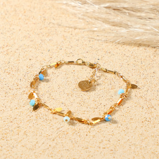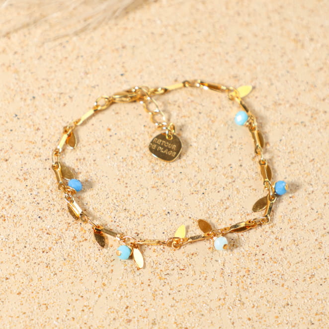 Découvrez notre bracelet femme Laurier, une création délicate et lumineuse qui évoque l’esprit nature et le charme des vacances au bord de mer. Ce bracelet pour femme allie avec harmonie des pétales dorés et des perles en verre bleues rappelant les reflets de l’océan. Parfait pour apporter une touche d’évasion et de douceur à vos tenues, ce bijou artisanal, doré à l’or fin 24K, est conçu pour sublimer chaque instant.