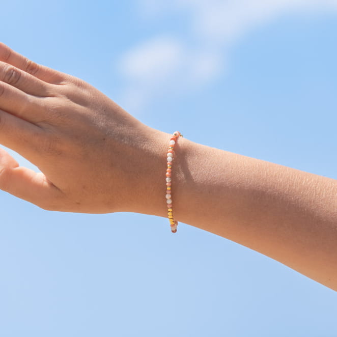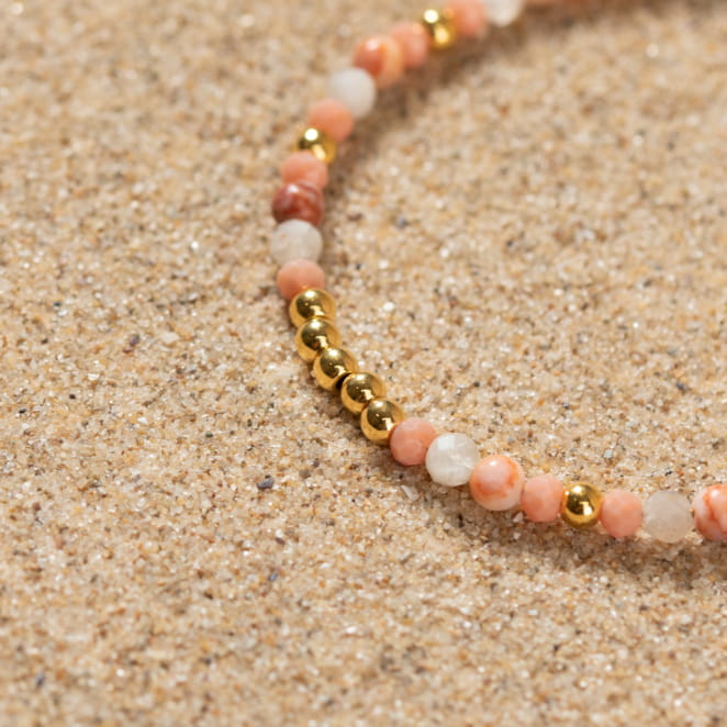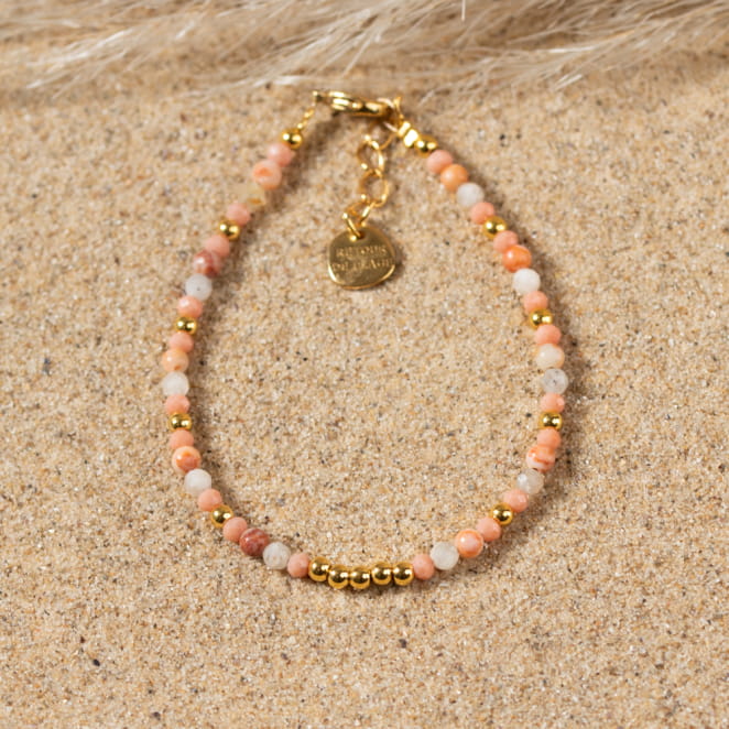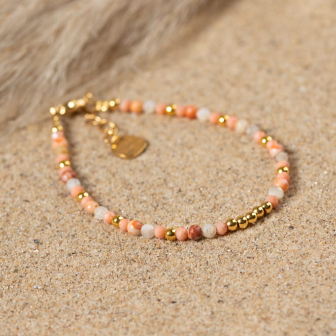 Laissez-vous séduire par le bracelet Luce, une harmonie de perles de sun stone rose, de métal doré et de pierres rouges. Ce bijou sublime votre poignet d'une touche éclatante aux teintes pastel, idéal pour illuminer votre style avec élégance et raffinement.