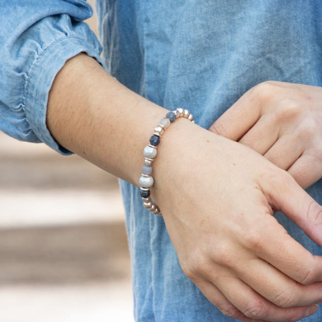 Optez par ce bracelet Lucia, raffiné et délicat avec ses perles rondes, pour sublimer votre tenue au quotidien. Retrouvez sur ce bracelet pour femme de jolies perles rondes en céramique et pierres naturelles aux tons bleutés qui apporta de la finesse à votre style.