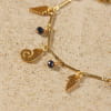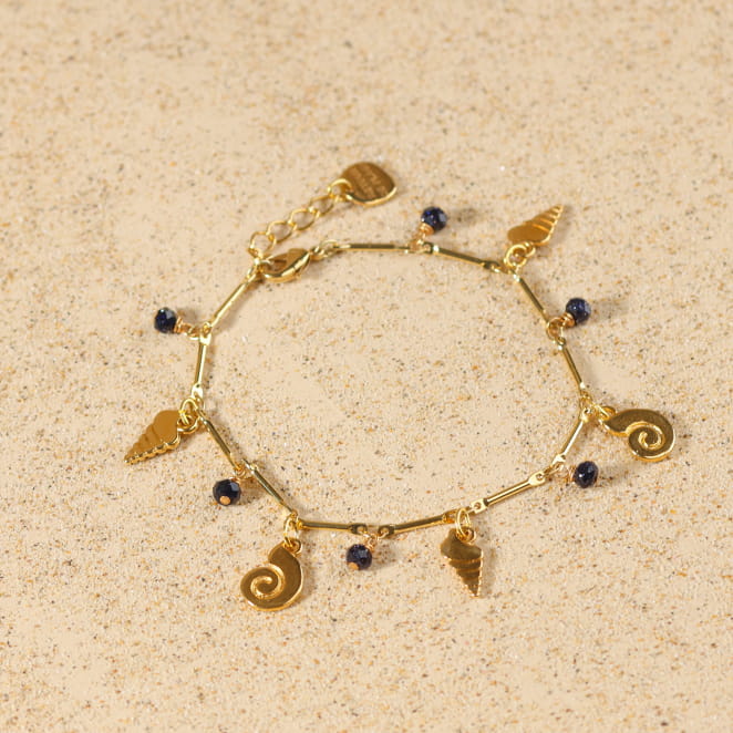Plongez dans l'univers marin avec le bracelet femme Manoa. Ce bijou délicat, orné de pendentifs dorées en forme de coquillages et de perles en pierre de sable bleu, danse délicatement sur votre poignet. Inspiré par l'océan, il évoque la douceur des plages et invite à la rêverie. Adoptez ce bracelet et laissez-vous emporter par sa beauté et son esprit marin !