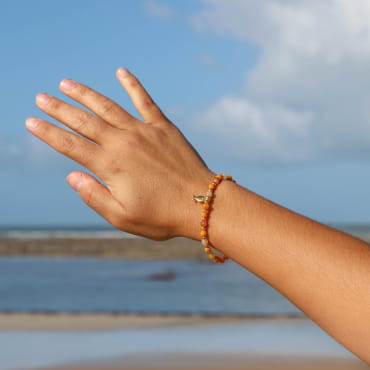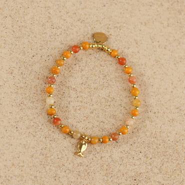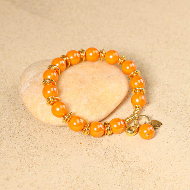 Plongez dans une ambiance chaleureuse et ensoleillée avec le bracelet pour femme en perles Marie, une création qui marie la profondeur des perles de verre orange à l’éclat des perles dorées, sublimées par un pendentif en forme de coquillage doré. voir plus