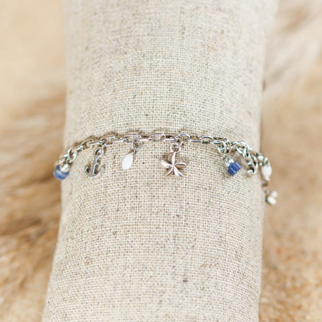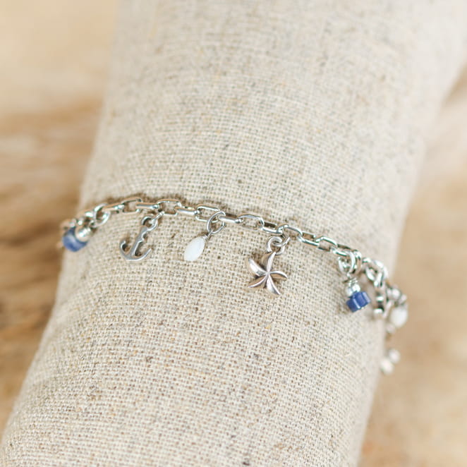 Découvrez notre bracelet pour femme Maritime, un bijou sobre qui rappelle le bord de mer grâce à ses petits pendentifs en forme d'ancre et d'étoile de mer. Ses perles en sodalite bleue et de nacre blanche apportent quant à elles un véritable équibre !
