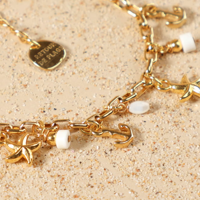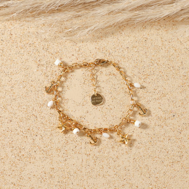 Découvrez notre bracelet pour femme Maritime, un bijou sobre qui rappelle le bord de mer grâce à ses petits pendentifs en forme d'ancre et d'étoile de mer. Ses perles en howlite beige et de nacre blanche apportent quant à elles un véritable équibre !
