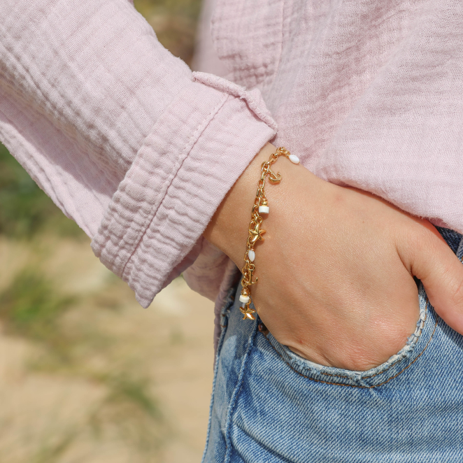 Découvrez notre bracelet pour femme Maritime, un bijou sobre qui rappelle le bord de mer grâce à ses petits pendentifs en forme d'ancre et d'étoile de mer. Ses perles en howlite beige et de nacre blanche apportent quant à elles un véritable équibre !