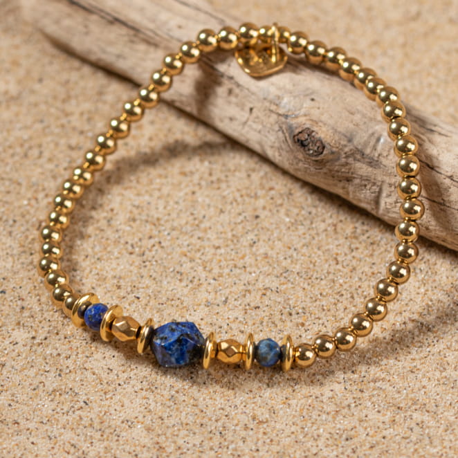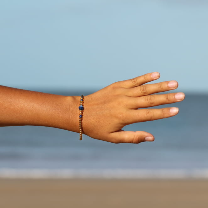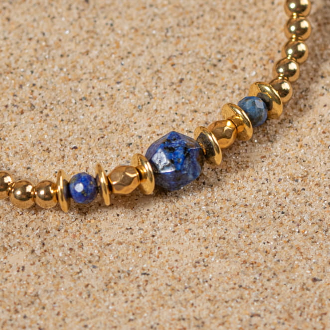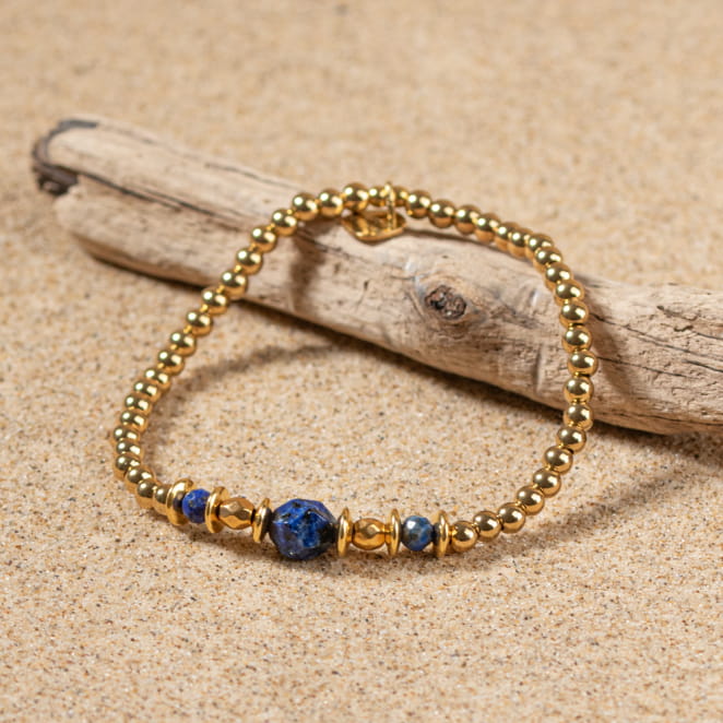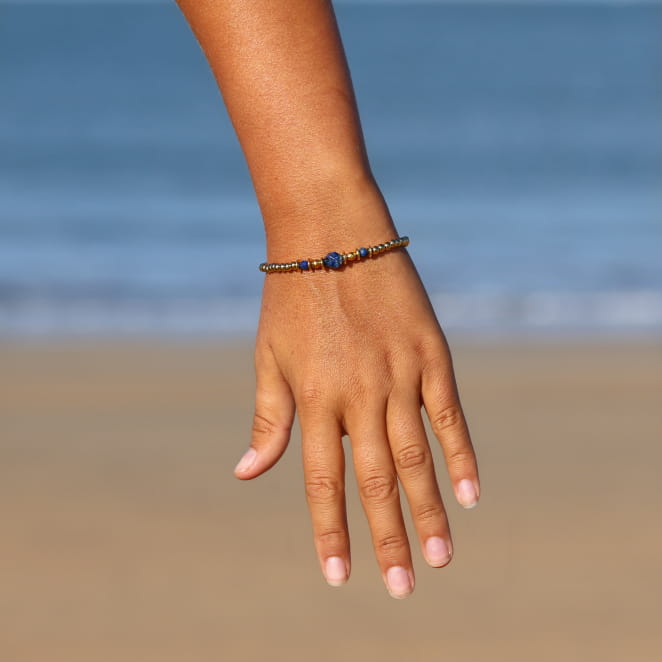 Le bracelet artisanal Marquise allie élégance et originalité avec sa perle bleue de Jade et ses perles de Lapis Lazuli. Sa délicatesse et son métal doré étincelant font de cet accessoire un choix parfait pour sublimer votre poignet.