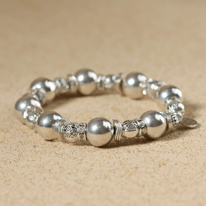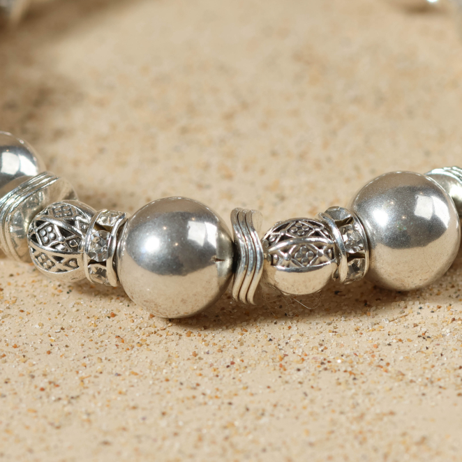 Optez pour le bracelet en perles Mélusine, un bijou artisanal qui mêle douceur et éclat. Ses perles argentées, rondes, plates et ajourées, rehaussées de strass, évoquent la lumière et l’esprit nature des bords de mer. Ce bracelet, est une invitation à l’évasion et à la simplicité.