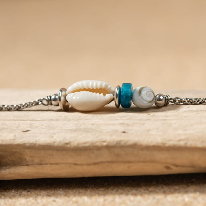 Embarquez pour un voyage au bord de l'eau avec le bracelet argenté Mina. Véritable hommage à la mer et aux vacances, il se pare d'un coquillage cauri, d'un œil de Saint Lucie et d'une pierre bleue en apatite. Chaque élément raconte une histoire de plage et de moments précieux sous le soleil. Symbole de chance et de protection, l'œil de Saint Lucie évoque les trésors trouvés lors de balades sur la plage. Ce bracelet, fabriqué en France avec soin, apporte une touche de poésie à votre poignet. Sentez la brise marine et laissez-vous emporter par son charme élégant !