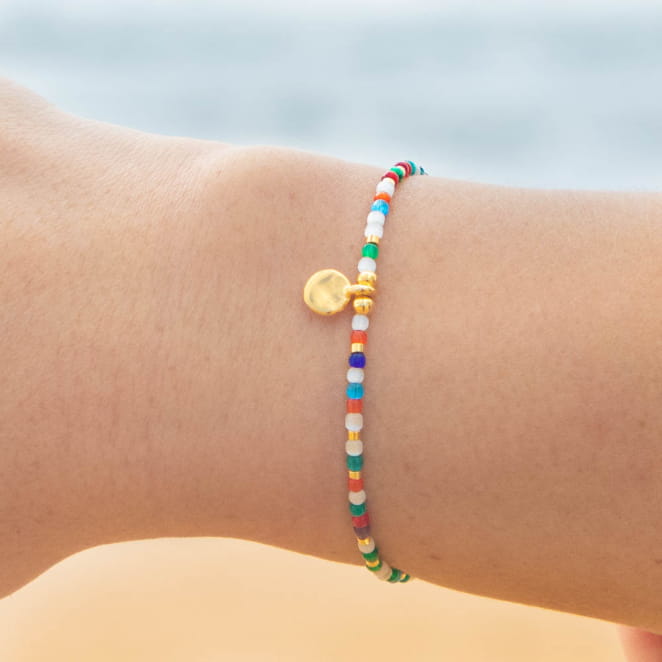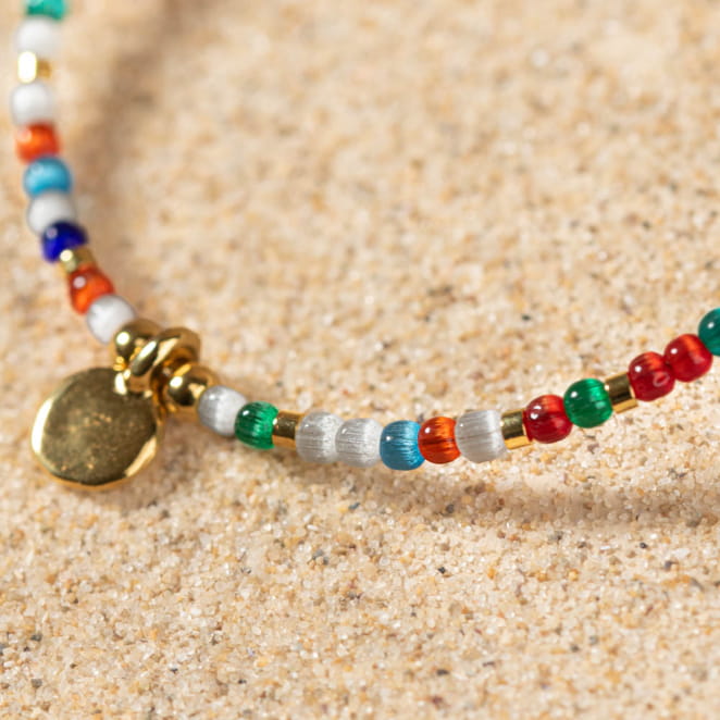 Ajoutez une touche d’élégance bohème à votre poignet avec ce bracelet fait main Minerve. Composé de perles dorées et de perles en verre délicatement assemblées, il reflète la lumière avec subtilité et charme. Son pendentif doré en forme de médaille apporte une finition raffinée, évoquant des souvenirs de voyages et d’aventures sous le soleil. Facile à porter au quotidien ou pour sublimer une tenue, ce bracelet chic et intemporel incarne la simplicité avec une pointe d’authenticité. Un véritable trésor artisanal !