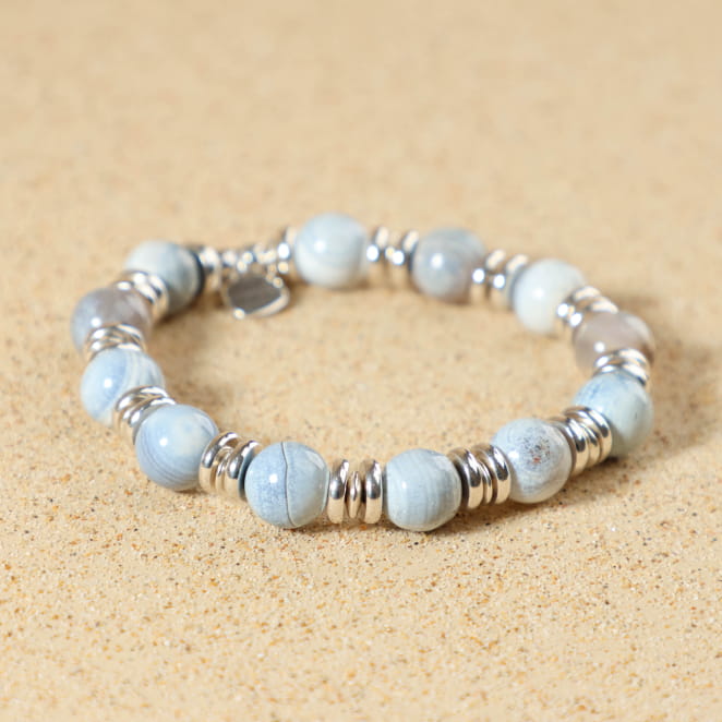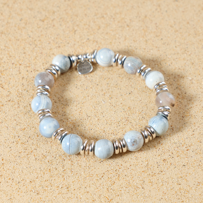 Évadez-vous vers l'immensité des océans avec le bracelet Minke, une création délicate et pleine de caractère ! Orné de perles en agate bleue, ce bijou rappelle les nuances infinies des eaux marines, du bleu profond au turquoise lumineux. Chaque perle, aux motifs naturels uniques, raconte une histoire. Ce bracelet est une ode aux voyages en mer, aux plages infinies et aux souvenirs gravés dans le sable. Le bracelet Minke est bien plus qu’un simple bijou : c’est un fragment d'océan à porter au quotidien. Ses tons bleutés invitent à la sérénité et à l’évasion, et son design intemporel le rend facile à associer avec n’importe quelle tenue, du casual chic à l’élégance décontractée ! Embarquez pour une aventure marine et laissez ce bracelet en agate bleue révéler toute votre connexion à la nature.