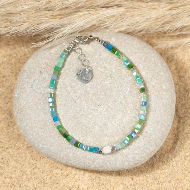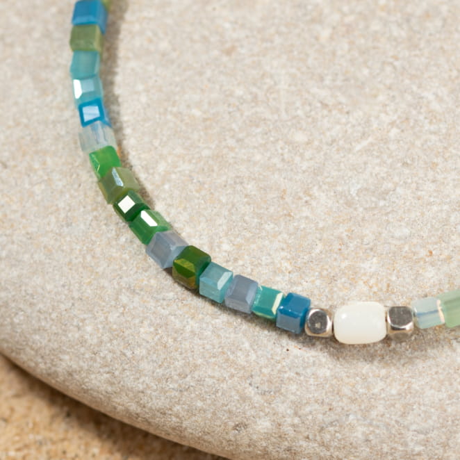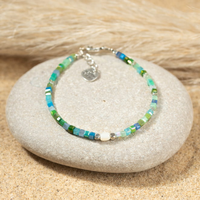 Découvrez le bracelet Murzo, un bijou argenté qui illumine votre poignet : orné de perles cubes en verre aux nuances bleu-vert et d'une perle en nacre blanche, il ajoute couleur et éclat à votre style. voir plus