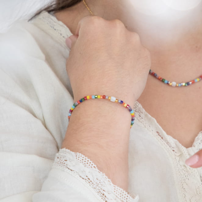 Apportez une touche de vitalité à votre style avec le bracelet Murzo, agrémenté de perles en verre multicolore et d'une perle en nacre blanche délicate. voir plus