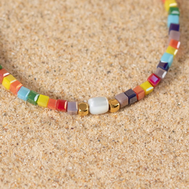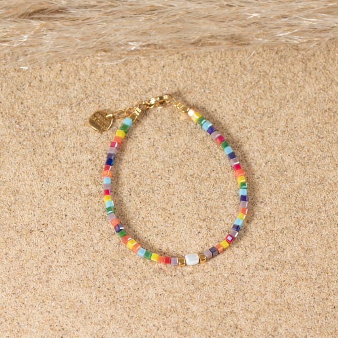 Apportez une touche de vitalité à votre style avec le bracelet Murzo, agrémenté de perles en verre multicolore et d'une perle en nacre blanche délicate. Ce bijou ajoute de la couleur et du dynamisme à votre tenue. Optez pour un look éclatant et plein de vie avec ce bracelet unique.