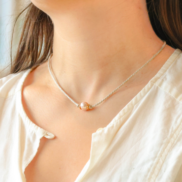 Le bracelet raffiné Nami est un hommage à la douceur de l’océan. Il se distingue par son cordon en lin naturel, rehaussé de pièces en métal doré rose et d’une perle centrale en nacre rose, évoquant un petit bouton de coquillage. Fin, délicat et féminin, il capte subtilement la lumière et sublime le poignet avec poésie. Un bijou inspiré par les trésors de la mer et l’élégance simple de la nature.