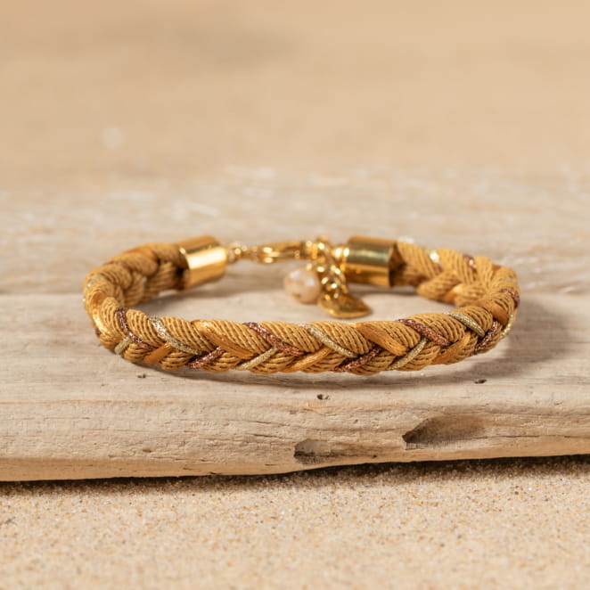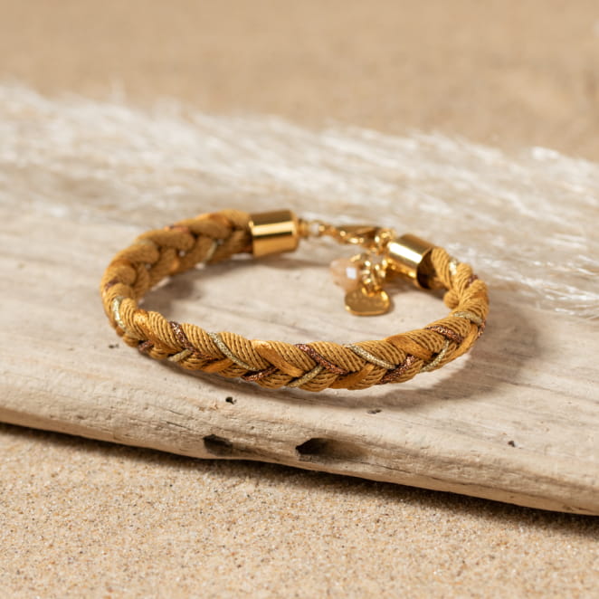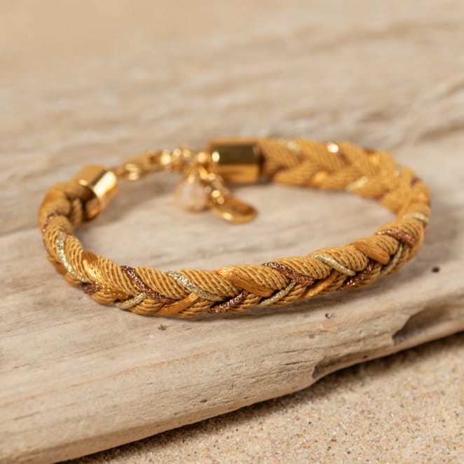 Découvrez le bracelet Natte, une tresse moutarde agrémentée de rubans pailletés. voir plus