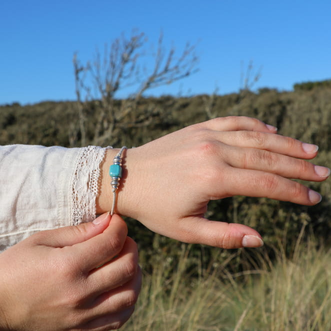 Neon, un bracelet élégant, délicat, est composé d'une jolie pierre carrée en céramique vert et de perles argentées. Agréable à porter avec son cordon en lin naturel, il deviendra votre allié du quotidien, ajoutant une touche de sophistication à votre style.