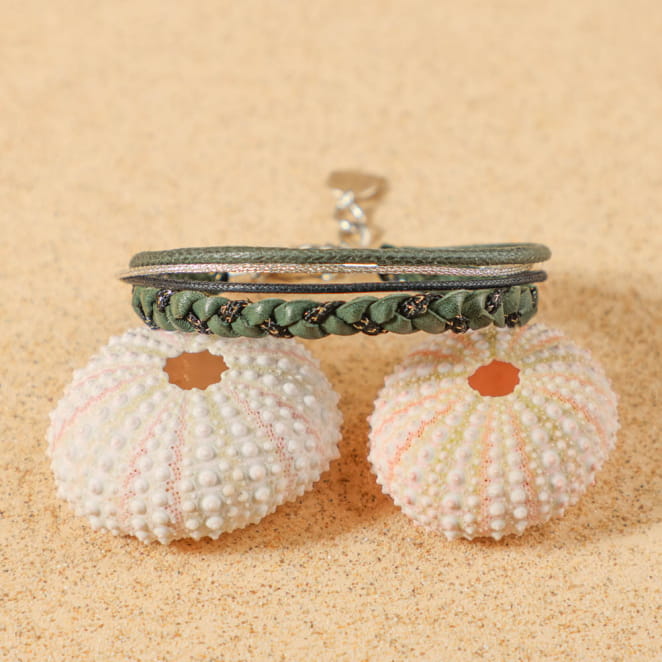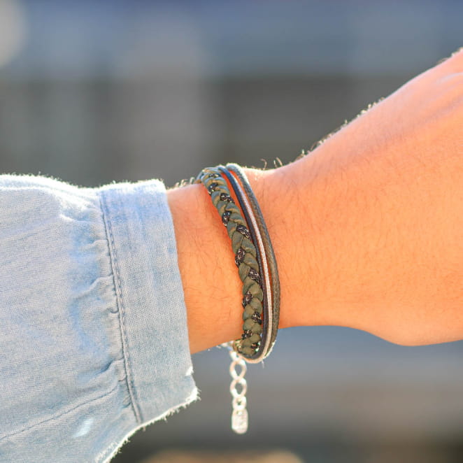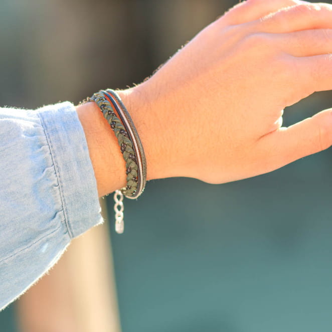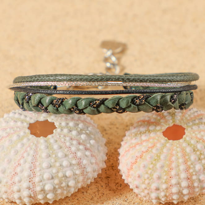 Sublimez votre poignet avec le bracelet femme Noa kaki et argenté. Cette pièce originale incarne l’élégance. Inspiré par les balades en forêt, ce bijou allie harmonieusement le kaki apaisant et les touches argentées lumineuses, évoquant la beauté brute et intemporelle de la nature. Le cuir tressé, souple et résistant, se marie à un cordon délicat argenté, pour créer un bracelet raffiné. Léger et confortable, ce bracelet devient vite un incontournable, rappel subtil de la nature et de ses bienfaits à chaque mouvement ! C’est aussi une belle idée cadeau pour les amoureuses de bijoux authentiques et artisanaux.