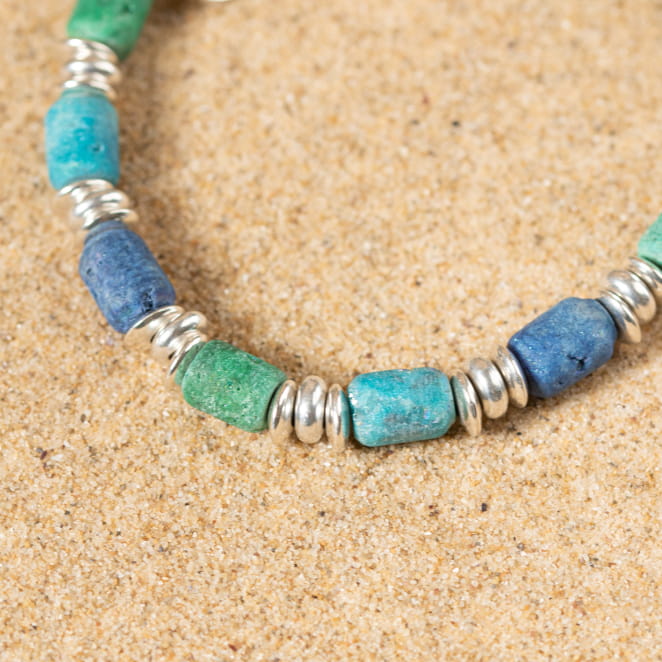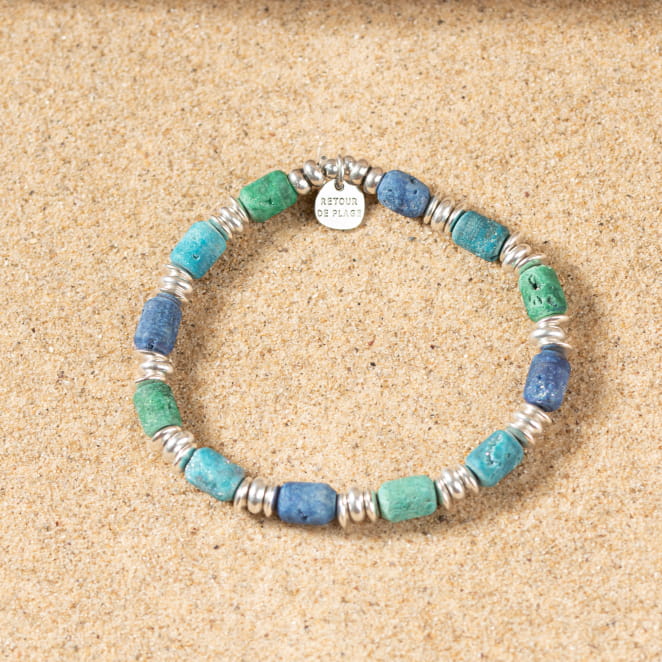 Sublimez votre look avec le bracelet Oda, un bijou fantaisie pour femme en perles argentées et en quartz bleu et vert. voir plus