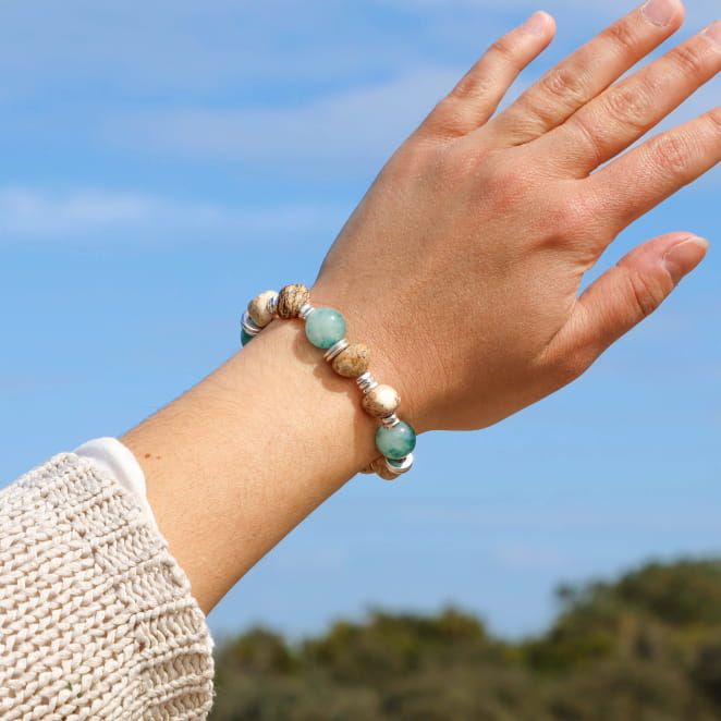 Optez pour ce bracelet femme Oletta, un bijou artisanal qui capture l’essence de la nature et de la sérénité des paysages côtiers. Ses perles en jaspe marron et ses perles naturelles vertes, associées à des perles argentées, en font une pièce unique et lumineuse, idéale pour accompagner vos moments d’évasion. Fabriqué en France, ce bracelet apporte une touche d’authenticité à votre style.