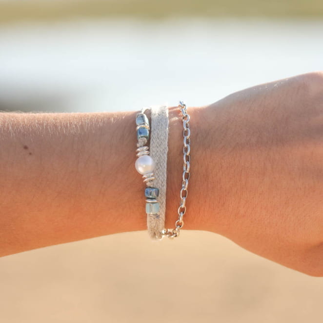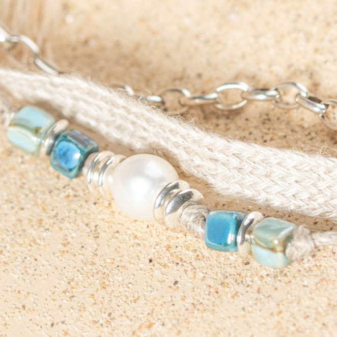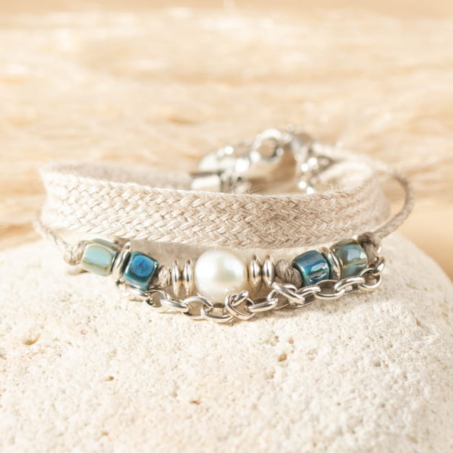 Laissez-vous séduire par le bracelet multibrin Otalia, qui marie subtilement le charme naturel du lin avec l'éclat d'une chaîne argentée. Au centre, une perle de rivière blanche, entourée de perles en céramique carrées bleues, rappelant les nuances apaisantes de l'océan. Un bijou unique, parfait pour compléter vos tenues en toute simplicité et élégance.