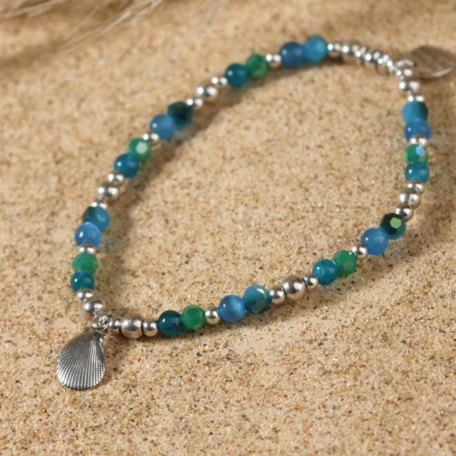 Habillez votre poignet avec le bracelet élastique Panopea, délicatement composé de perles œil de chat bleue, de perles en verre bleues et de touches argentées lumineuses. Chaque détail évoque la douceur estival, mêlant nuances féminines et éclats sophistiqués. Confortable et facile à enfiler, un bracelet lumineux qui respire l’élégance et la sérénité.