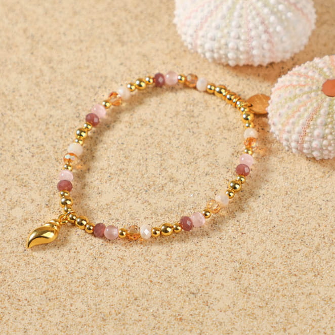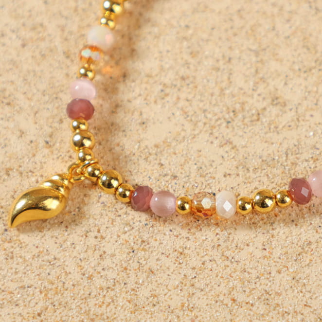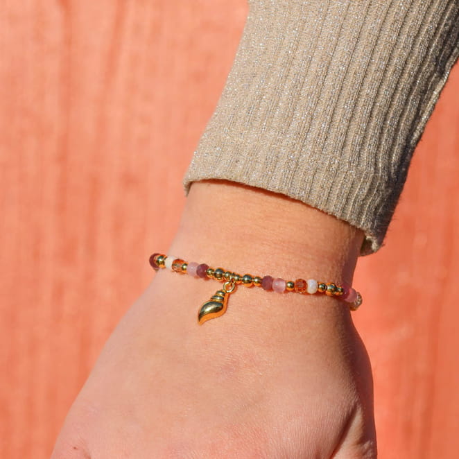 Habillez votre poignet avec le bracelet élastique Panopea, délicatement composé de perles œil de chat rose, de perles en verre violet et de touches dorées lumineuses. Chaque détail évoque la douceur estival, mêlant nuances féminines et éclats sophistiqués. Confortable et facile à enfiler, un bracelet lumineux qui respire l’élégance et la sérénité.