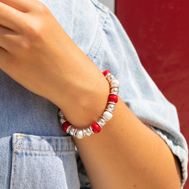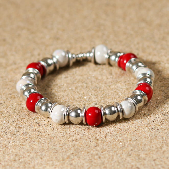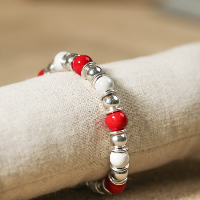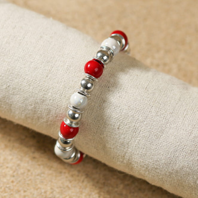 Découvrez le bracelet Patel, une élégante symphonie en céramique blanche et rouge, ornée de perles argentées. voir plus