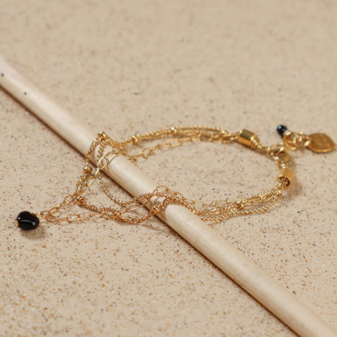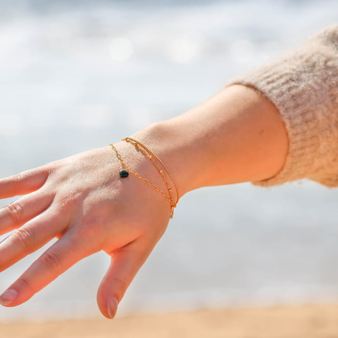 Sublimez votre poignet avec le bracelet Penny, une pièce délicate qui mêle finesse et audace. Avec ses chaînes dorées ultra-fines et son pendentif cœur en verre noir, ce bijou incarne à la fois la douceur du romantisme et l’intensité d'un style audacieux. Idéal pour celles qui aiment les contrastes, il apporte une touche élégante et affirmée à toutes vos tenues, du quotidien aux occasions spéciales !
