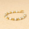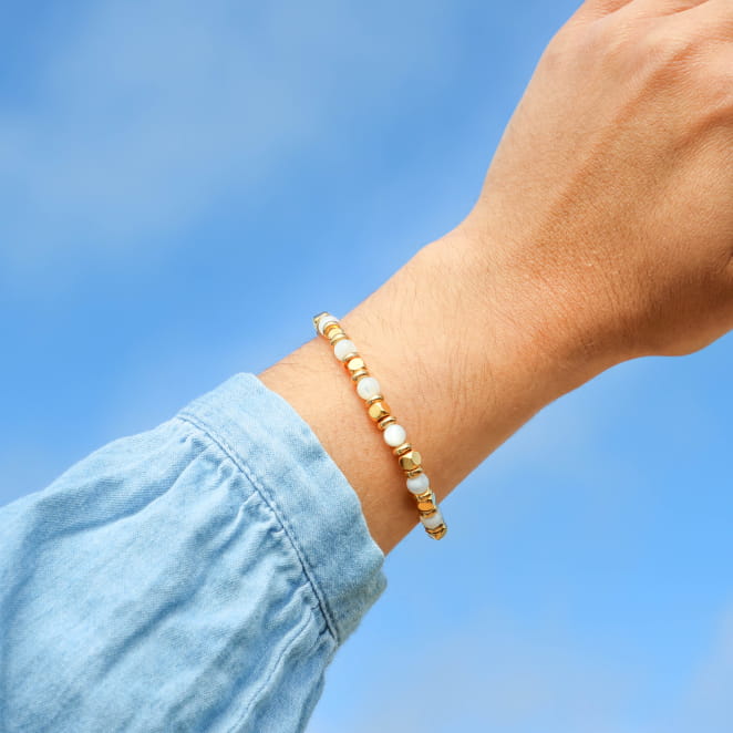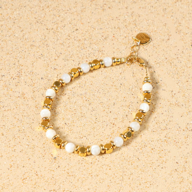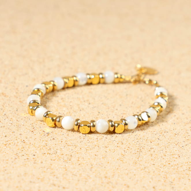Un éclat doux comme une fin de journée sur le sable chaud : le bracelet Pétronille joue les contrastes raffinés entre la chaleur du métal doré et la fraîcheur irisée de la nacre ! Montées sur un câble discret, ses perles en nacre naturelle alternent avec des perles dorées pour un jeu de lumière subtil. Moderne et tendance, ce bijou féminin s’ajuste parfaitement à votre poignet grâce à sa chaîne de réglage et son fermoir mousqueton doré. Un bijou à la fois discret et solaire, qui accompagne vos journées d’été comme vos tenues plus habillées. À porter seul ou en accumulation, il sublime la peau avec élégance.