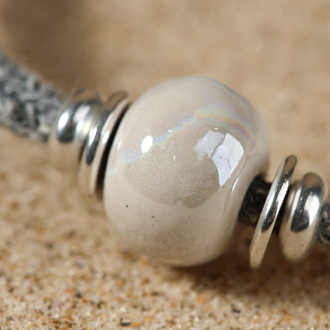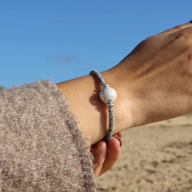 Adoptez le bracelet réglable Porto en éco jean gris, orné d'une élégante perle en céramique blanche. voir plus