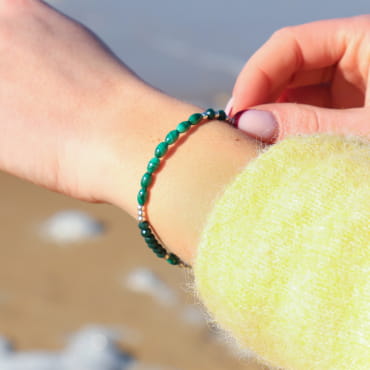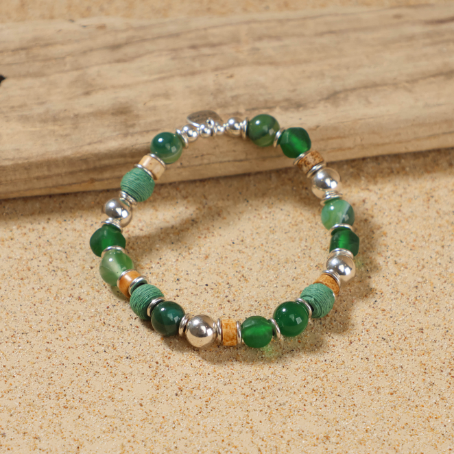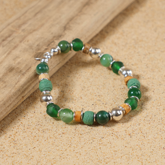 Apportez naturel avec le bracelet Profond, où le vert bouteille se mêle avec des perles en agate verte, les nuances prodondes et apaisantes des perles en verre recyclé vert ajoute lumière naturel. Les touches de jaspe marron s'harmonisent avec les perles en polymère bio-sourcé, tandis que l'argenté donne éclat à votre poignet.