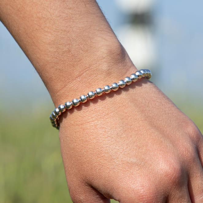 Le bracelet Puce est un indispensable ! Simple et élégant avec ses perles rondes en métal argenté, il se porte aussi bien seul qu'accompagné. Grâce à son montage sur élastique, il permet un enfilage rapide et pratique.