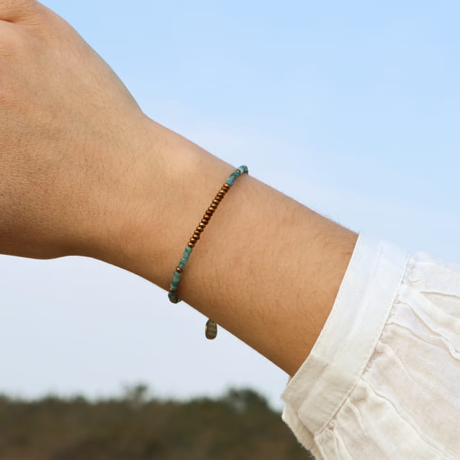 Optez pour le bracelet Ranime, un bijou fait main qui allie le bleu pétrole profond et le métal bronze pour un style à la fois naturel et raffiné. Inspiré par les paysages côtiers, ce bracelet évoque l’évasion et la sérénité des vacances au bord de l’eau. Ses perles en tourmaline bleu et ses détails en métal bronze en font une pièce unique, fabriquée en France avec soin.