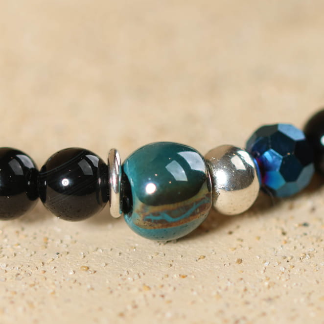 Découvrez le bracelet pour femme Ricou, une harmonie subtile entre la profondeur de l’onyx noir et la fraîcheur des perles en céramique verte, rehaussée par l’éclat des perles en verre bleues et grises. Ce bijou unique, inspiré par le bord de mer apporte une touche d’élégance naturelle à votre poignet.