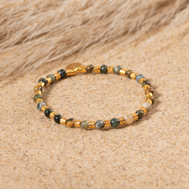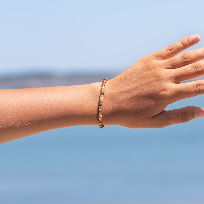 Réchauffez tous vos looks de ce bracelet Rimini. Délicat et élégant, ce bracelet fin en perles de jaspe océan multicolore et en métal doré ajoute une touche de chic chaleureuse et naturelle à votre poignet. Un bracelet idéal à intégrer dans une accumulation de bracelets.