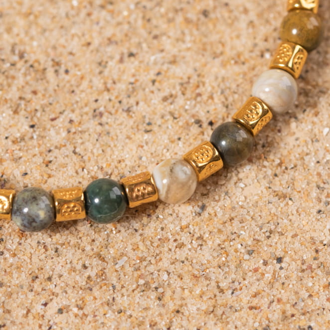 - de petites perles en pierre de jaspe océan multicolore et en métal doré d'un flash d'or 24 carats,