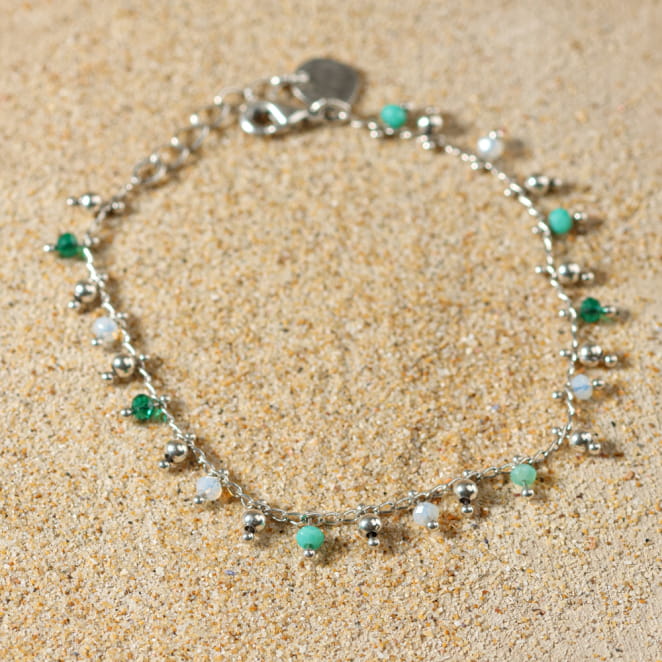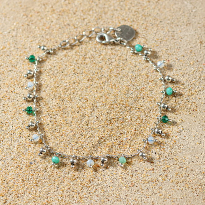 Ce délicat et élégant bracelet Ronde est un indispensable ! Ses perles vertes accompagnées de sa chaine argentée mettent en valeur votre peau. La finesse de ce bijou le rend irrésistible et idéal à porter au quotidien.