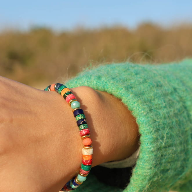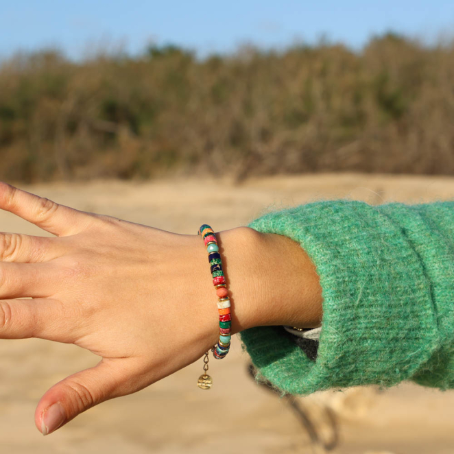 Craquez pour notre délicat et éclatant bracelet Santa aux couleurs vives. Ces pierres multicolores et ces perles en verre multicolore vous transporteront au coeur des plages au bord de l'océan Atlantique. Des couleurs d'été élégantes pour accompagner vos looks au quotidien.