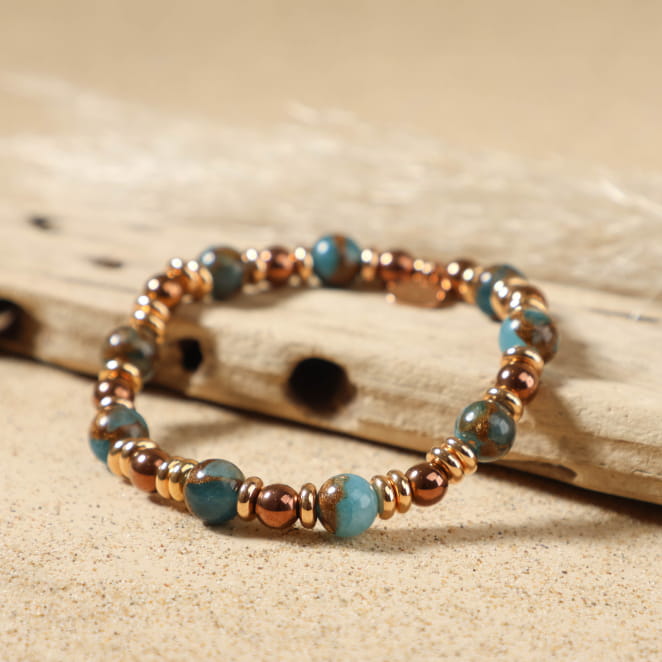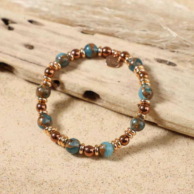 Découvrez notre bracelet Serena : un bracelet pour femme mêlant des tons apaisants et une touche de lumière cuivrée. Ses perles bleues s’harmonisent avec les perles cuivrées et dorées rose. L’hématite cuivrée apporte une note lumineuse quand aux perles bleues, elles vous font voyager au bord de l'eau. Léger et élégant, ce bracelet est conçu pour accompagner vos journées avec grâce et sérénité.