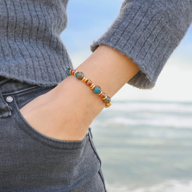 Découvrez notre bracelet Serena : un bracelet pour femme mêlant des tons apaisants et une touche de lumière cuivrée. Ses perles bleues s’harmonisent avec les perles cuivrées et dorées rose. L’hématite cuivrée apporte une note lumineuse quand aux perles bleues, elles vous font voyager au bord de l'eau. Léger et élégant, ce bracelet est conçu pour accompagner vos journées avec grâce et sérénité.