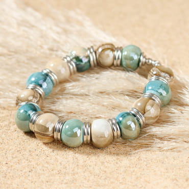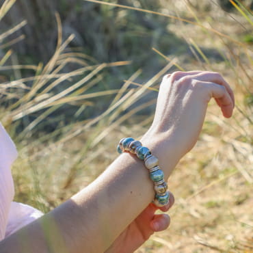 Adoptez le charme du littoral. Le bracelet Sina, est inspiré par les rivages et les promenades les pieds dans le sable, ce bracelet capture l’essence de la nature brute et apaisante de la côte atlantique. Chaque perle marbrée évoque les galets ramenés par l’océan. Monté sur un fil élastique, il est ajustable et discret, il épouse délicatement le poignet, comme un souvenir précieux rapporté d’un été.