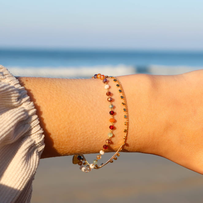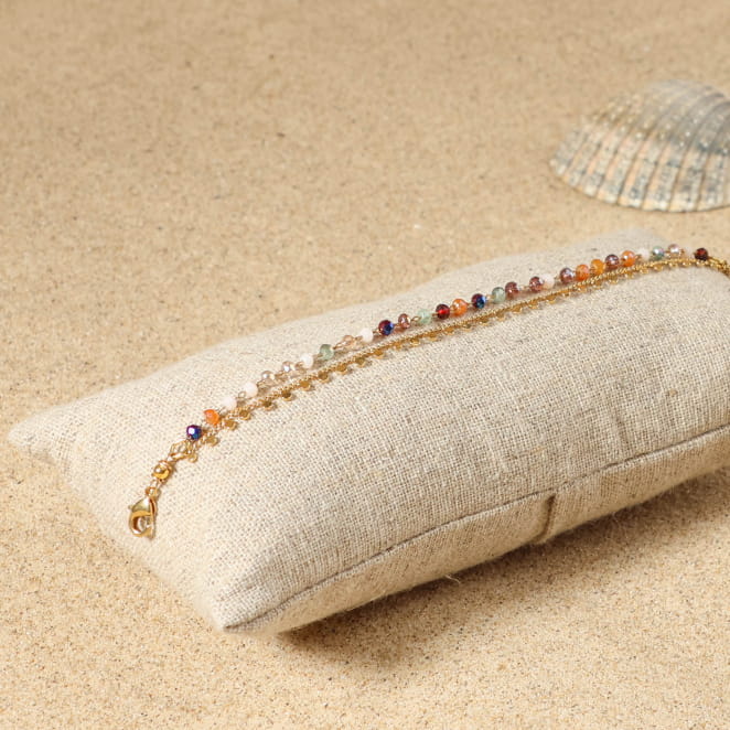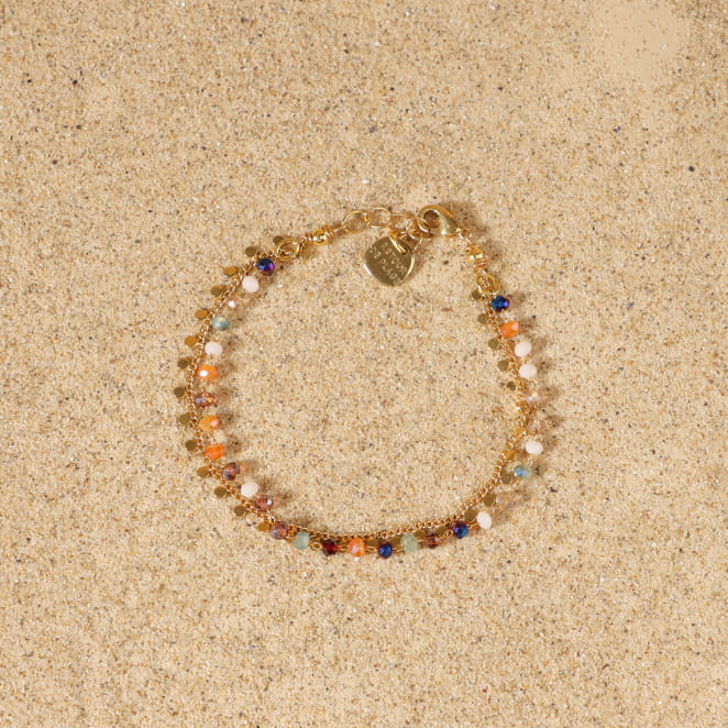 Appréciez au tour de votre poignet le bracelet pour femme Solange, un bijou multicolore et doré qui apportera subtilement de l'éclat à votre tenue. Composé de chaînes, les petites perles en verre multicolores ajoutent couleur et harmonie élégante aux perles disques dorées. Un bijou pour femme chic et moderne qui s'associe à toutes vos tenues.