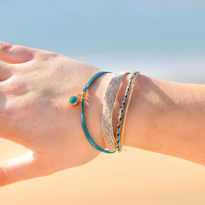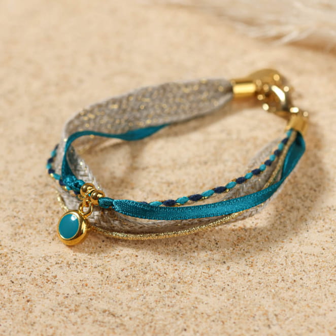 Adoptez un style bohème et raffiné avec le bracelet multi-brins Taiwan. Un ruban en lin naturel pour une touche authentique, un ruban satin bleu au doux éclat, un cordon multicolore en fil coton polyester pour une note vibrante et un fil polyester doré pour une subtile lumière. Une composition harmonieuse qui joue sur les textures et les reflets, à enrouler autour du poignet pour un effet délicatement estival.